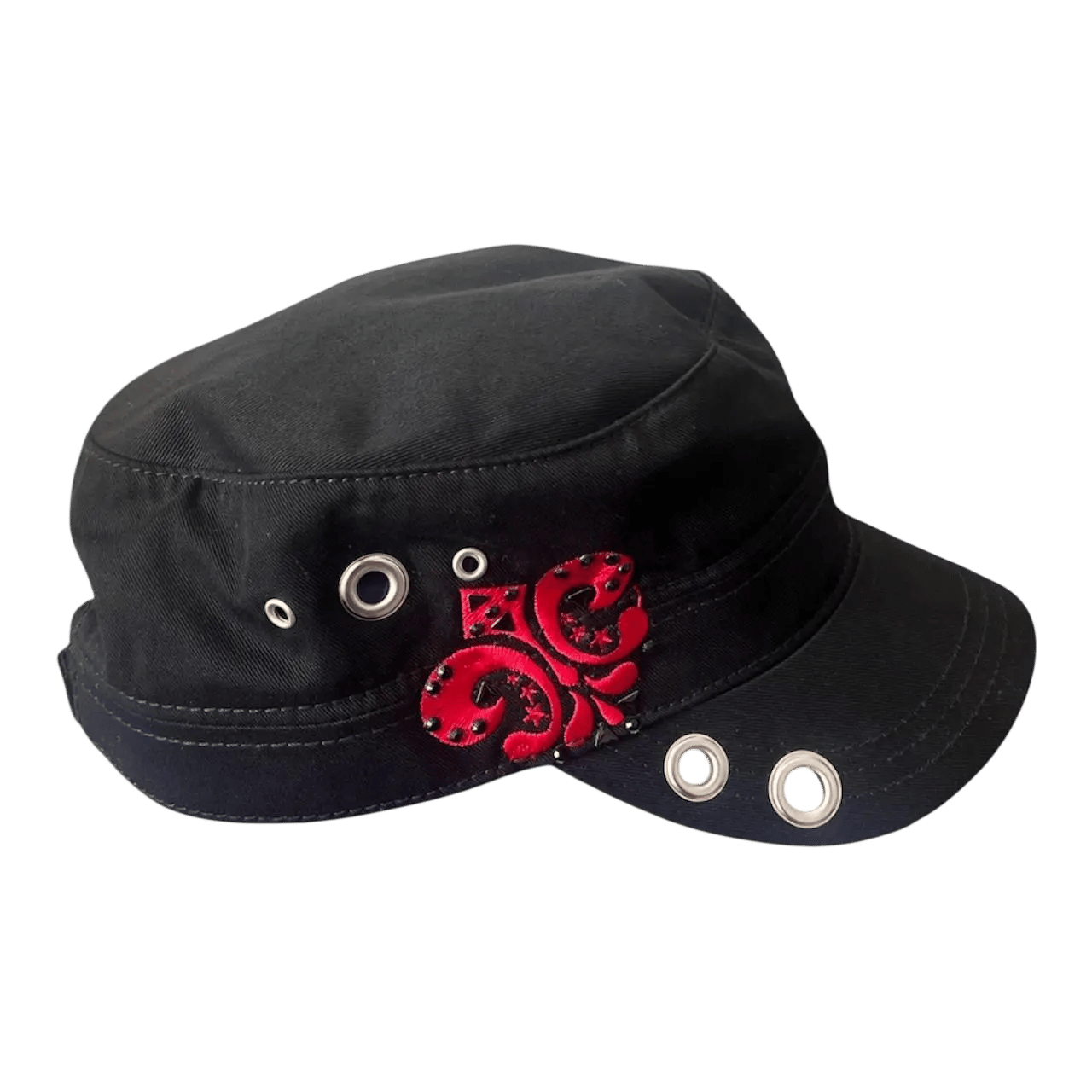 includes a red embroidered accent and grommets