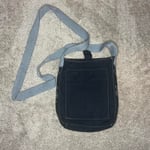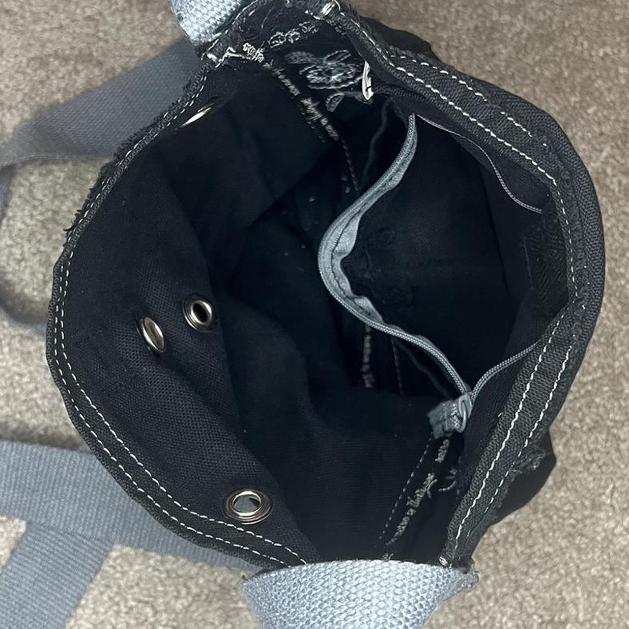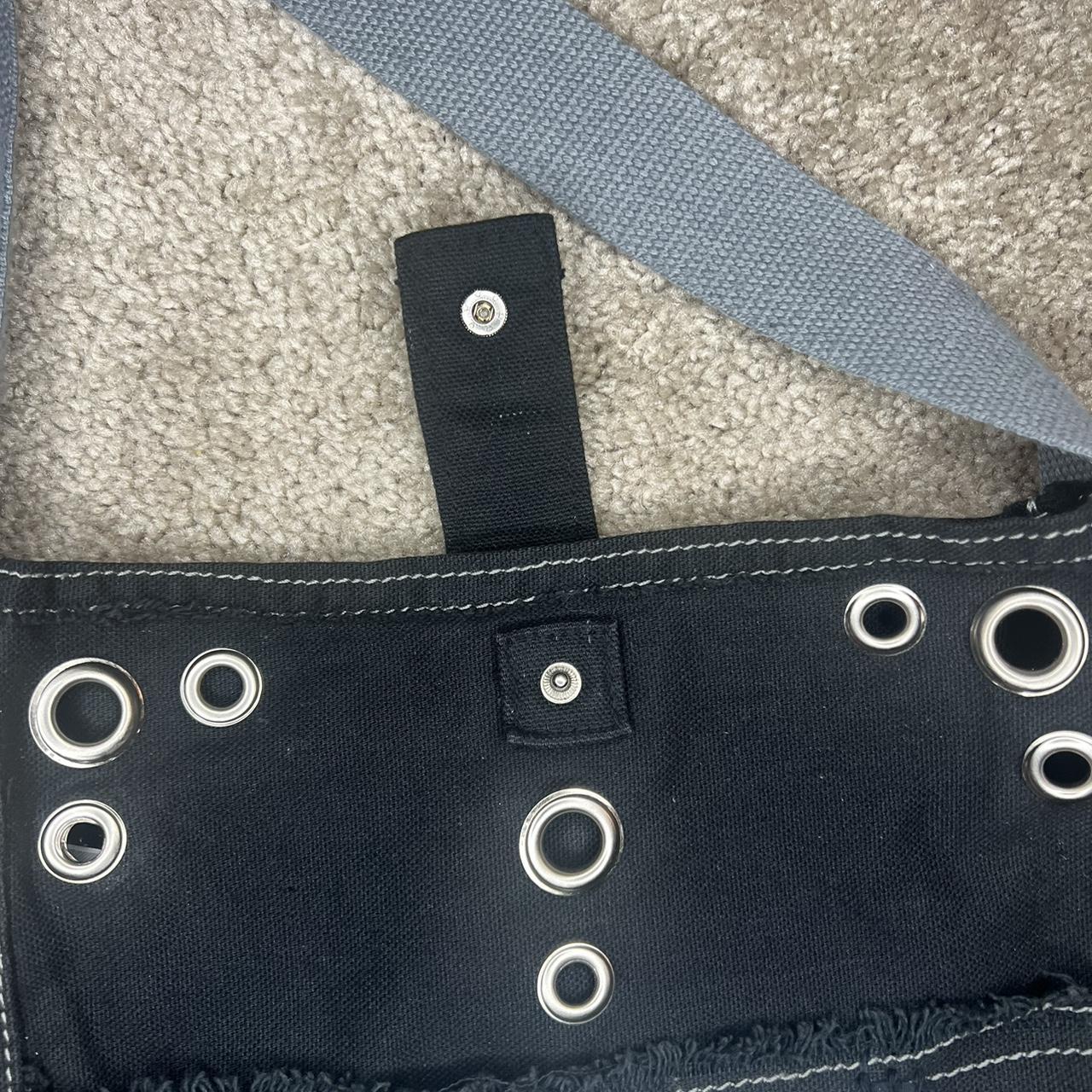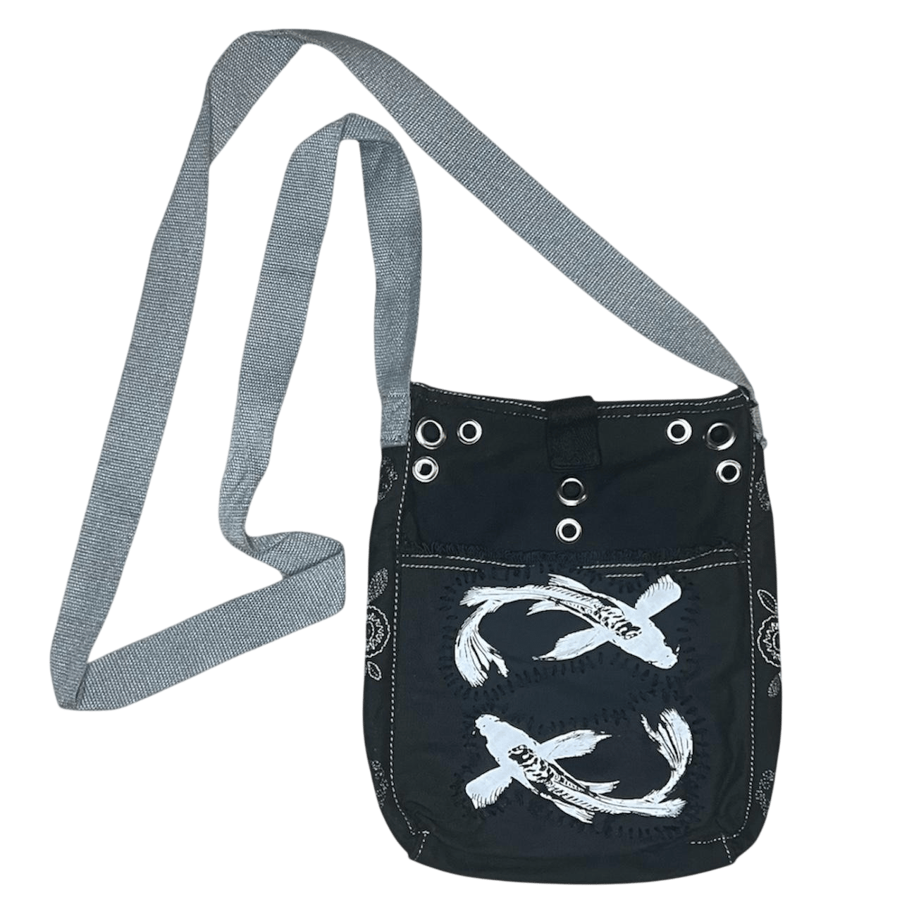 •Black & white fish print crossbody bag with strap • hand printed & sewn patches • hand pressed grommets • this item is made with recycled materials and contains imperfections •