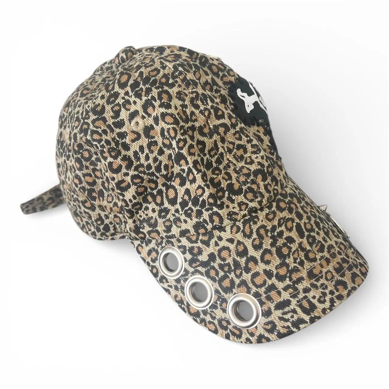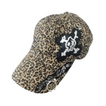 Leopard print baseball cap with skull and crossbones design