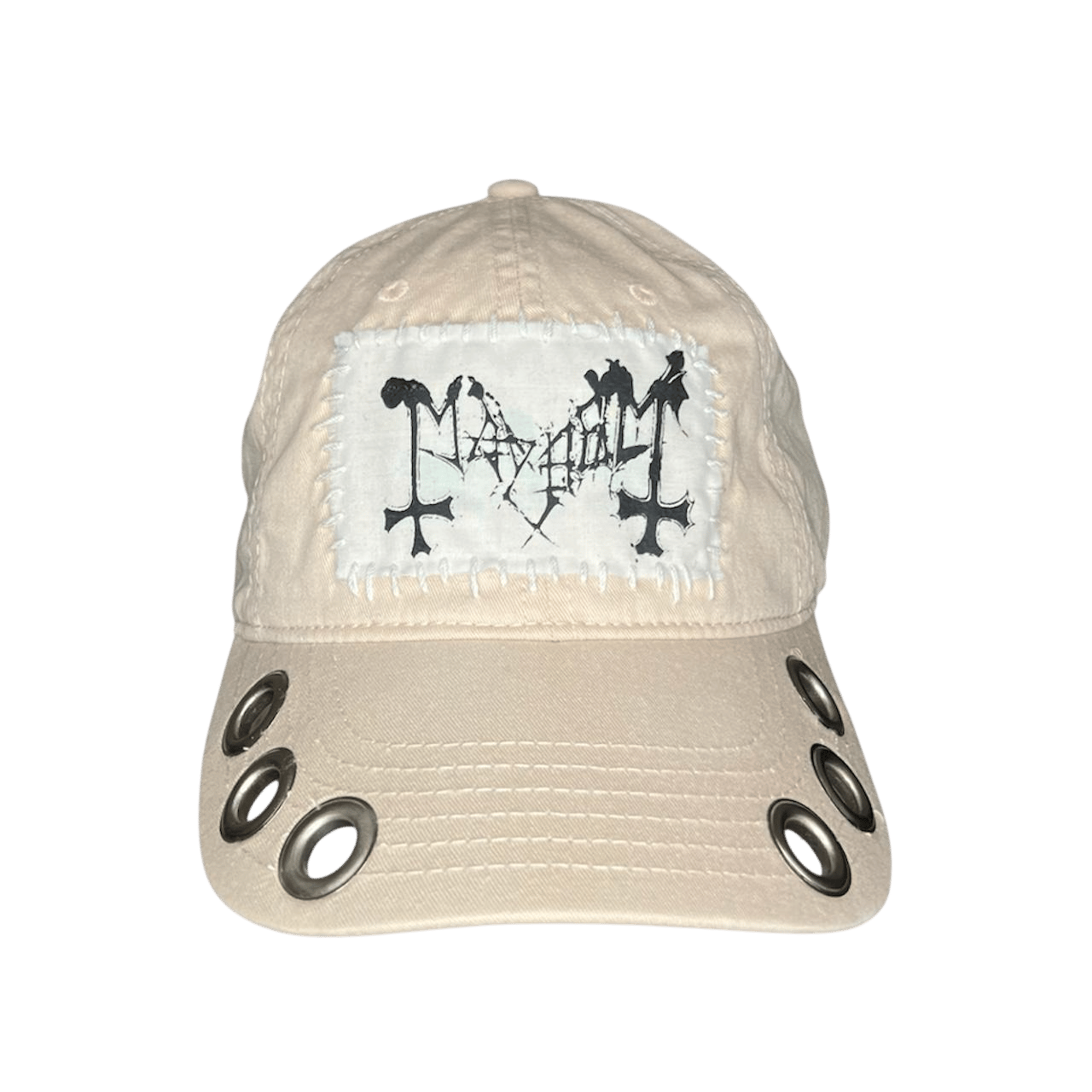 • includes a white mayhem patch and grommets along the brim •