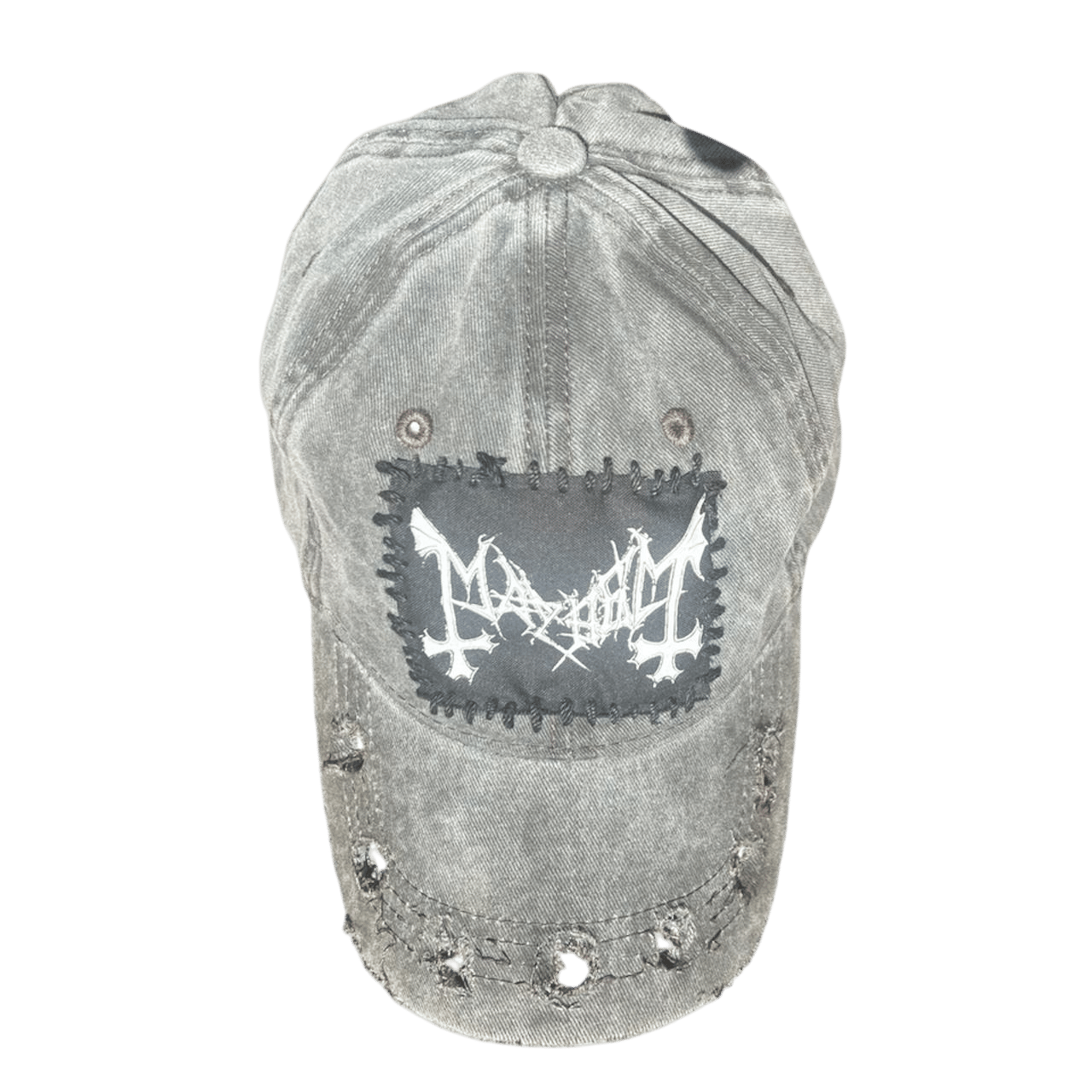• includes a mayhem patch, distressed holes along the brim, and a hole in the back for ponytails •